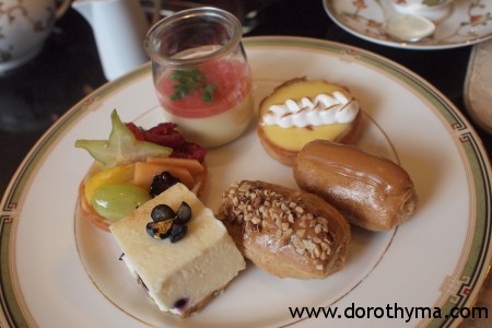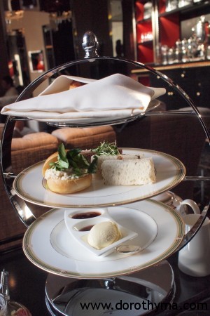 這裡的Tea Set是三層,最上層是英式鬆餅,中間是Finger Sandwiches,最底的是果醬及Clotted Cream。甜點則在我們吃到一半的時候,店員另外奉上的。中間的三文治不錯,都是傳統的配搭,不是青瓜,就是蛋沙律,又或是火腿配蜜糖芥末醬。