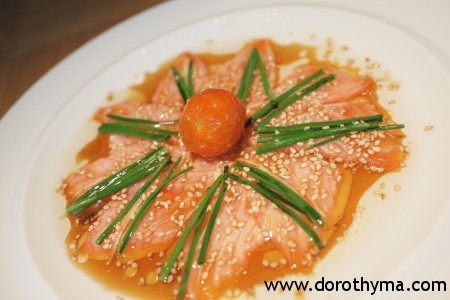 另外一道是Sashimi Salad with Matsuhisa Dressing (GBP 16),這個沙律汁是Nobu最有名的,當中有大量洋蔥及蘿蔔蓉, 日本醬油, 麻油, 葡萄籽油, 米醋混合出來, 吃起來酸酸甜甜,帶濃濃洋蔥的香味, 很開胃呢。