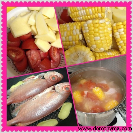 5)煮滾一大鍋水,將所有材料(番茄、薯仔、粟米、已出水的瘦肉、已煎好的大眼雞魚及魚湯)放進煲裡,以中至慢火煲約兩小時,最後加鹽調味,即成。