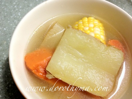 剛過去的一個月,經常飛來飛去出差,少了時間在家煲老火湯,皮膚也差了不少。終於在忍無可忍的情況下,某一晚在下班後,以九秒九的速度跑到菜市場買材料,回到家快手快腳也要用了兩個半小時去煲個湯。回到家,弄得來,煲得來,也到晚上九時半才有湯喝。這樣也好,第二天早上將湯翻熱,放進保暖壺,將湯帶回公司喝,感覺特別好呢~