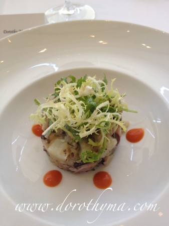 一年一度的Hyatt Fair,世界各地的Hyatt酒店代表也齊集在香港Grand Hyatt,向旅遊業介紹他們的酒店。當中上海的Andaz曼谷的Grand Hyatt、泰國華欣的Hyatt Regency及即將開幕的吉隆坡Grand Hyatt聯合辦了一個傳媒午餐會,很榮幸能參與其中。關於這幾間酒店的介紹,遲一點再慢慢寫,又或是等我有機會去當地,住完再跟大家分享。那天午餐會在灣仔Grand Hyatt酒店的Grissini,吃了幾道菜,最喜歡這個八爪魚沙拉,單看賣相已知很適合夏天吃,爽口的八爪魚,真的令我吃完一口想再一口,不少數分鐘就吃完了。