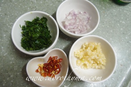 2)蒜頭及乾蔥洗淨,切碎;番茜洗淨,去莖部,切碎;辣椒乾切絲。