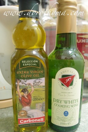 5)將白酒慢慢加入,然後再加入剩下一半的蒜蓉及無鹽牛油煮一會。