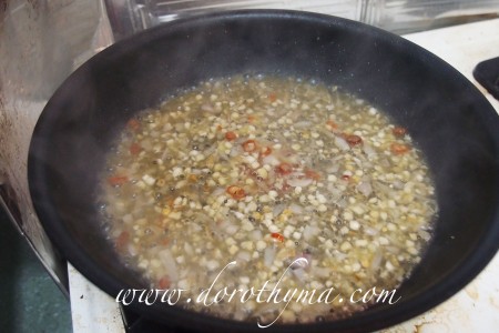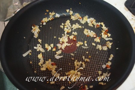 4)燒熱煎pan,中火下一湯匙Extra Virgin Olive Oil,將乾蔥、一半的蒜蓉及辣椒乾爆香。