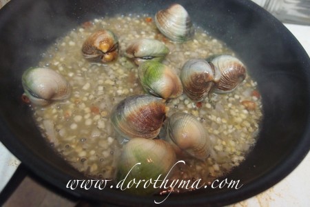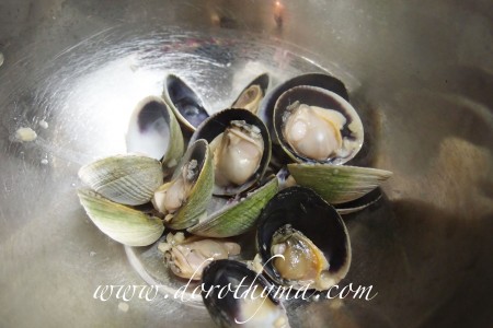 7)3分鐘後,打開蓋,先取出已開口的蜆放在大碗中。再蓋上蓋煮多2分鐘,如果蜆未開口,即是代表蜆已死,記得即時拿走。