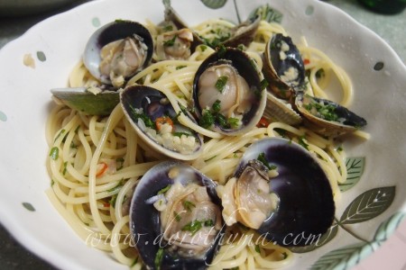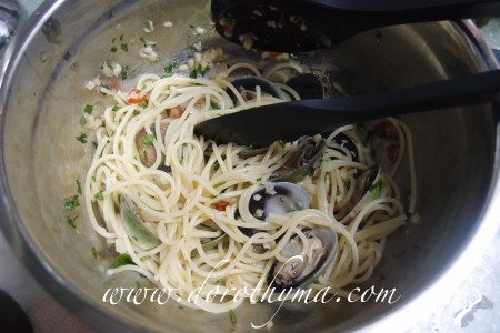 8)將已煮熟的大蜆及意大利粉放在大碗中,加入番茜碎及煮完蜆肉的白酒汁拌勻上碟即成。