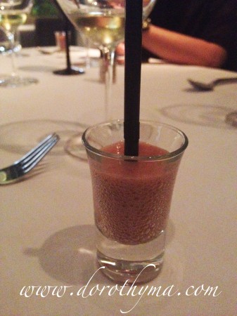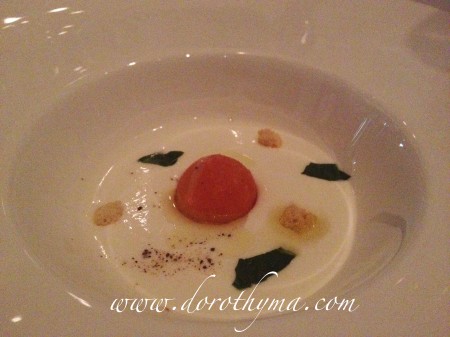 未上頭盤,大廚先送上Pre-appetitizer給我們,是一個Mozzarella 番茄凍湯,味道跟平常在外面吃的一片片Mozzarella Cheese沒兩樣,只是芝士味道濃一點,還有是液體跟固體的分別。中間的番茄是雪芭來的,跟Mozzarella一起喝,蠻特別的。