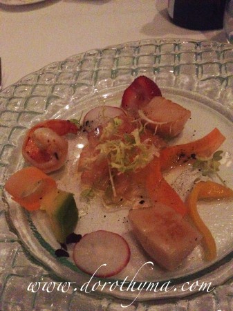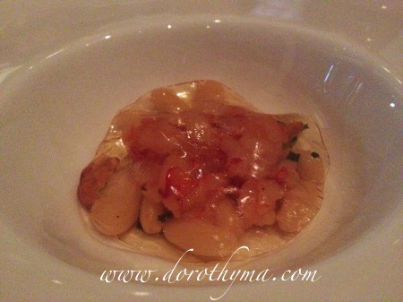 頭盤先來了大家都想吃的西西里紅蝦他他,伴Cannellini Bean及烏龍茶Jelly。因為大廚來了香港大半年,希望在傳統的意大利菜裡加入一些中國的元素,所以特別造了這層薄薄的烏龍茶Jelly,跟紅蝦他他一起吃。老實說,寄望甚高的烏龍茶Jelly沒有想像中濃味,不過紅蝦他他的確是非常非常的新鮮,非常讚。可惜的是放在底的Cannellini Beans夾雜太多Basils,跟紅蝦他他一起吃的話,Basils搶去了其他食物的味道,難色有點失色。