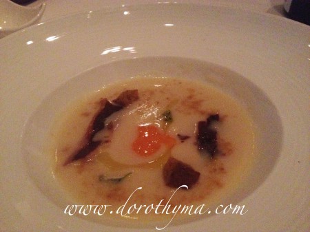 餐湯則是時令的白露荀湯~這個湯,白露荀味道濃郁,最特別之處是加了煙燻蛋黃、煙肉及四川麻辣,喝湯前攪拌好才好喝。整個湯,充滿層次,那個麻辣及煙燻蛋味道,跟白露荀出奇地配搭得宜。