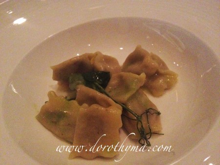 First Main Course是Orange Scented Duck Ravioli with Mint flavoured green peas sauce,吃過這麼多Ravioli,我覺得這個真的做得很好,很對辦。Ravioli的皮不會太厚,帶點蛋香;鴨肉餡帶微微的橙香,很清新,鴨肉又夠嫩;加上薄荷味的青口醬汁,在夏天吃最好,Ravioli造成細細粒,吃完都不覺膩。