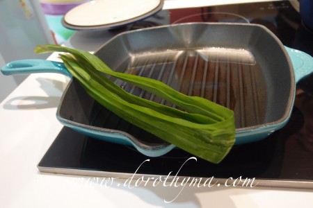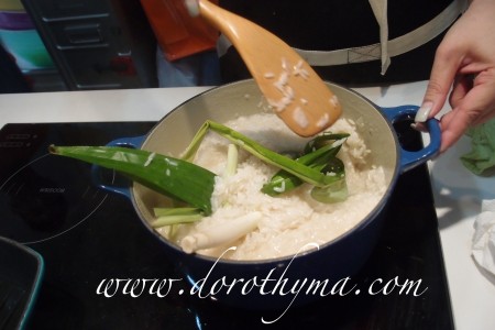 加入斑蘭葉及香茅,記得要將他們放進粥中間。