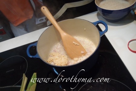 再爆香乾蔥碎及蒜蓉(份量是大量乾蔥碎,蒜蓉大約是乾蔥碎的四份一),再加入白米炒勻。