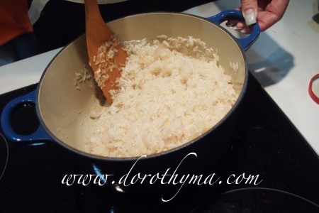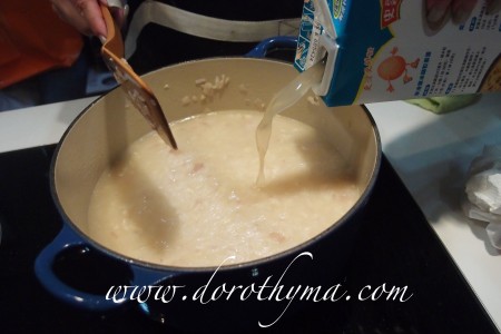 再加入雞湯煮米飯,記著雞湯要慢慢加入,不要一次加入。待米飯慢慢吸收雞湯後,才再加雞湯。