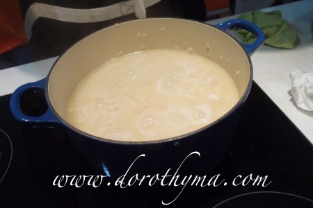 當米飯煮至稍粥狀,就可停止加雞湯,再煮至粥面有一個個小氣泡的時候,熄火。