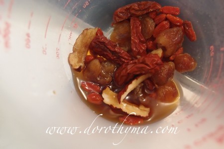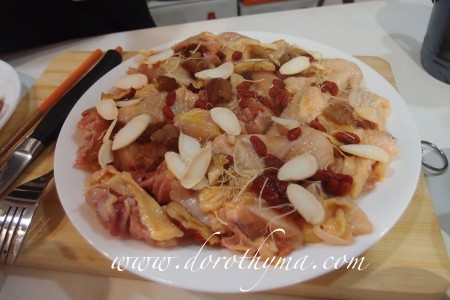 先將雞件洗乾淨,以生抽、老抽、生粉、麻油、紹興酒及糖將雞件醃半小時至一小時。再約杞子、圓肉及鮮人參片放在雞件上。
