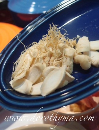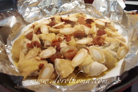 好了!煮完雞油飯又怎可能沒有雞呢?平時在家裡做金針雲耳蒸雞就多,但鮮人參蒸雞則是第一次。