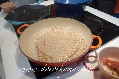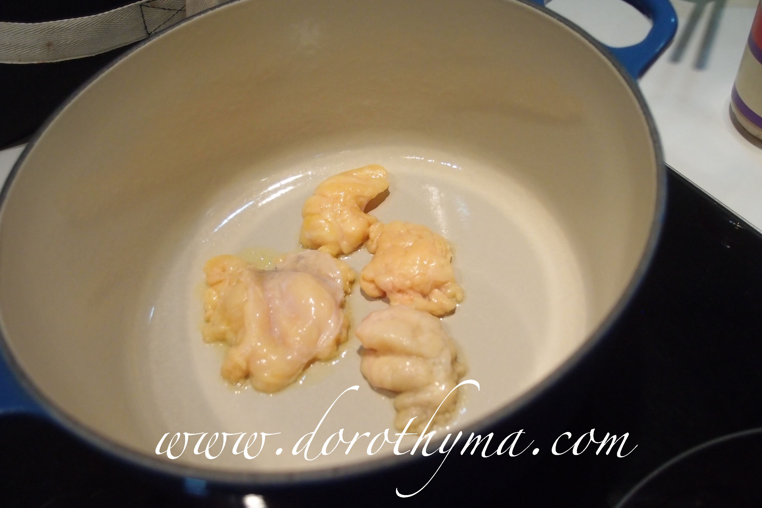 今次煮這個海南雞油飯用的是Round French Oven,先開細火,將新鮮雞油放在鍋中間,將雞油煎出,拿走剩餘的雞油渣。