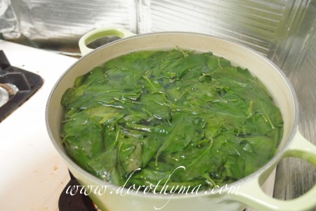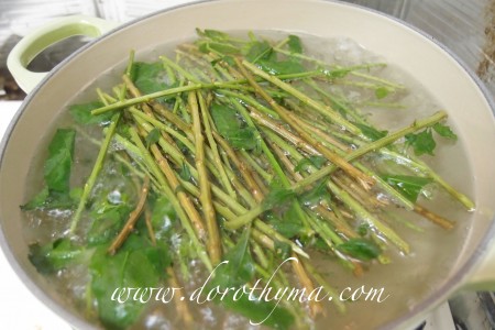 2)半小時後,將枸杞莖拿起,將枸杞菜及豬肉片加入,煲一小時。