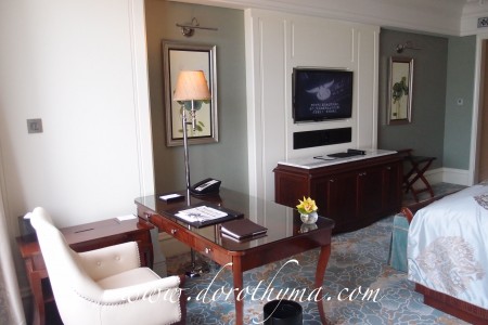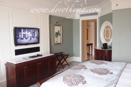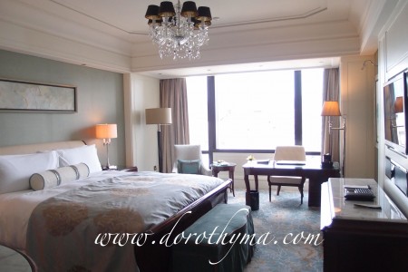 今次我住的房間是King Deluxe River View Room,是豪雅臨江客房,一張大床,房間有50平方米,房價平均每晚約3千多人民幣。一踏進房間,再一次是美呆了,古典美也不失現代感,地方寬躺。大大的水晶吊燈,超高的床,我想說的是,在這裡睡了兩晚,都睡得超好,晚上一覺睡到天亮,大床很舒服。