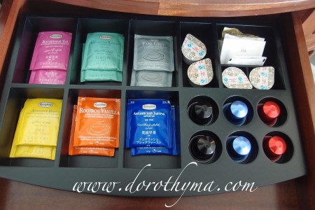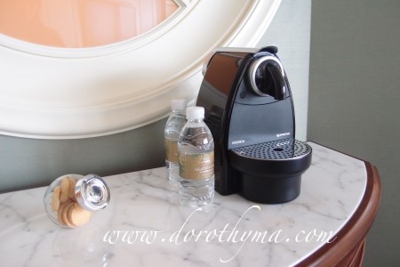 每間房都有Nespresso咖啡機,是我慣常在家飲的咖啡,在外地也可喝到在家的味道。酒店安排細心,知道喝咖啡的人,總會想在喝咖啡後,吃一些甜的,咖啡機擺放著小小的曲奇餅,而且每天都會換上不同的口味~