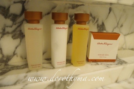 衛浴用品用的是著名品牌Salvatore Ferragamo,豪華至極,配合華爾道夫酒店奢華高貴的形象。