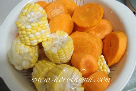 2)紅蘿蔔去皮,洗淨切件;粟米洗淨切件;栗子去殼去皮,備用。