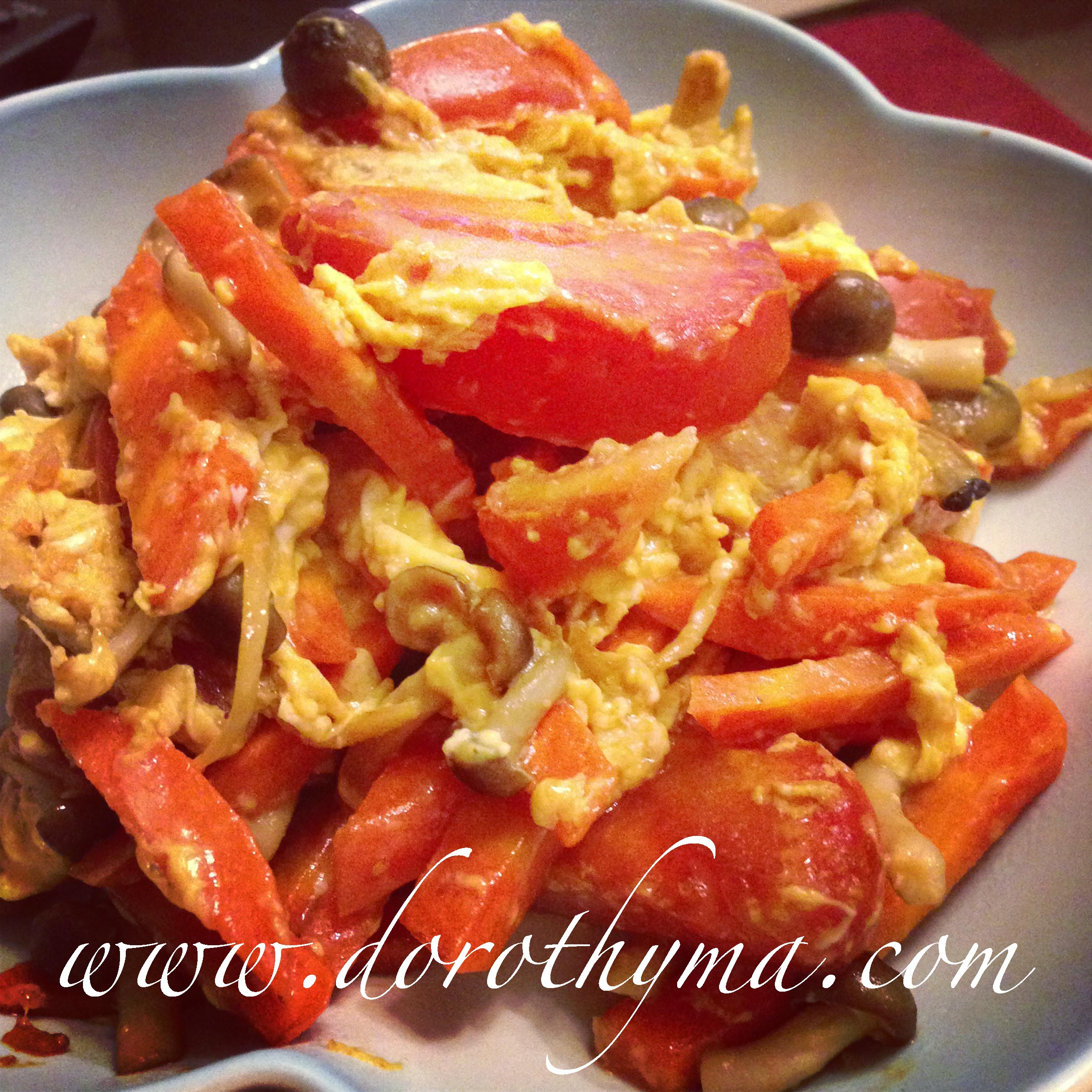 我本身愛吃雞蛋,很多時想起要煮的菜式都關於雞蛋。這天晚上逛超市,突然很想吃番茄炒蛋,買了番茄及雞蛋。想著不如吃得再健康一點,再買了紅蘿蔔及本菇,快樂回家弄個炒蛋作晚餐。這道菜,不消廿分鐘就煮好,放工後也容易買到材料啊!