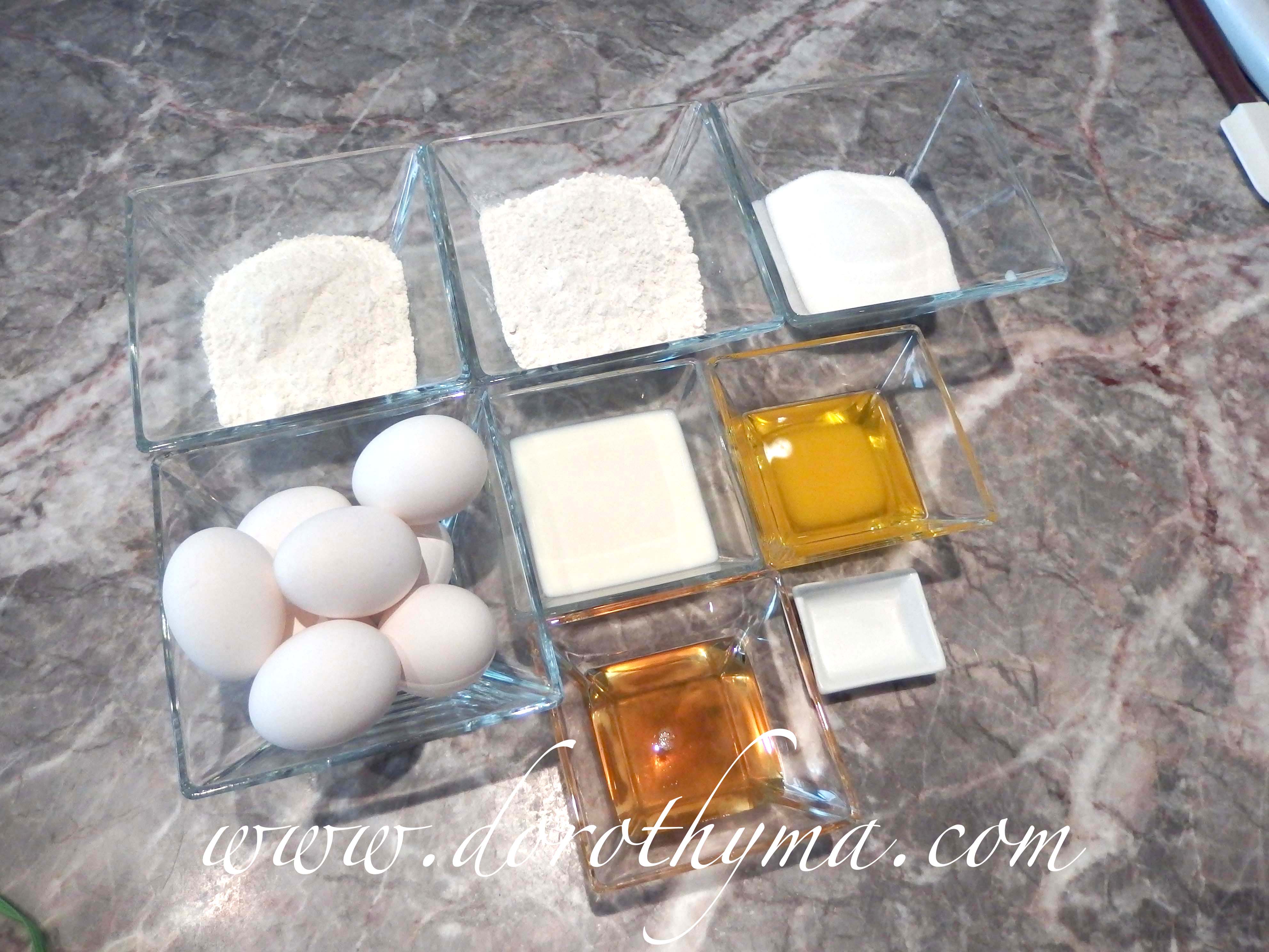 材料方面相當簡單,包括:雞蛋4隻、砂糖62克、蜂蜜60克、鹽少許、牛奶60克、低筋麵粉72克、高筋麵粉62克、已溶牛油25克,這個份量可做一個6吋圓形的蛋糕。