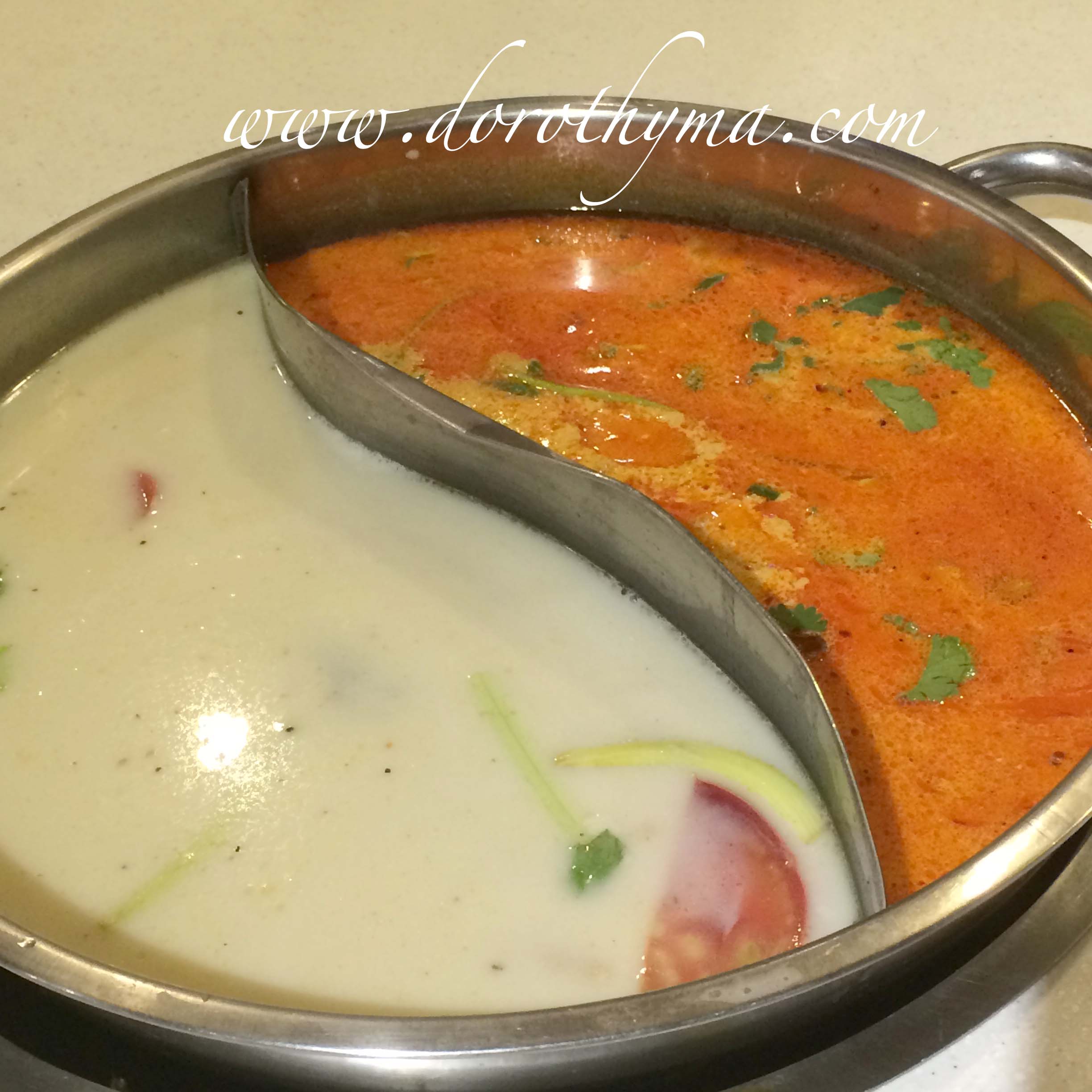 之後再來,又跟另一班朋友來,是舊同事為我慶祝生日。我們五個女子,又點到一檯都是食物。湯底選了鴛鴦鍋,魚頭湯底是必點,另一邊鍋點了冬蔭公湯底。其中一位舊同事原來之前也有自己來過這裡,她說冬蔭湯底不錯,我們又試試。試了一口,果然很「冬蔭公」,湯勺一撈又是足料到尖叫,全部都是大頭蝦、香茅、檸檬葉等香料~