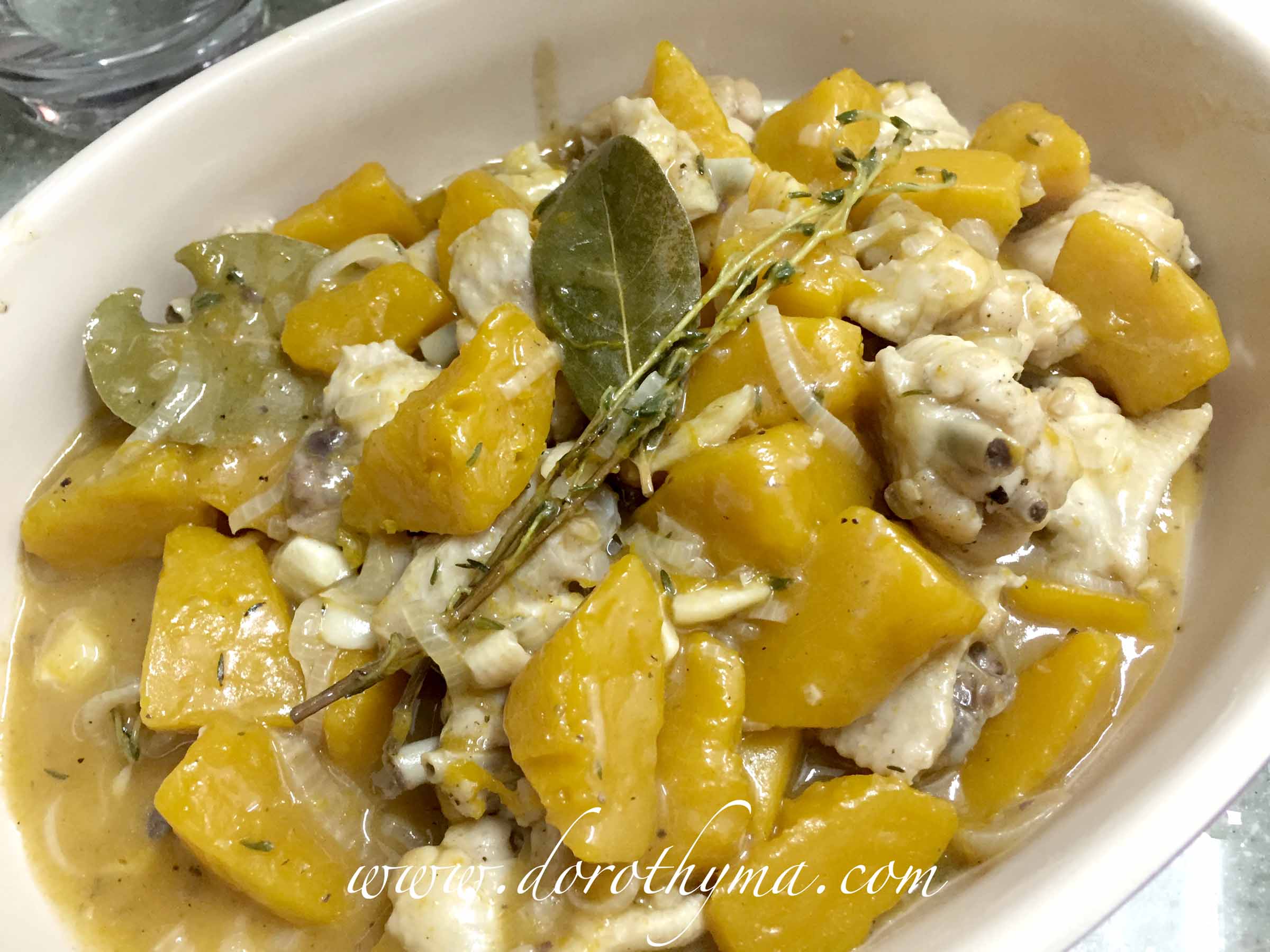 這位朋友懂吃,對吃有要求,連她也這樣說,應該是很好的品質,才會令她老遠買回家。這品牌叫S-Pure,是泰國品牌,有供應雞及豬肉,品質監控嚴格,包裝上有QR code追蹤肉類來源,買也買得安心。朋友介紹完只見她買了兩盒回家,我也買了一盒,回家弄了個煎雞扒,如她所說,果然只需用鹽及胡椒醃肉10分鐘,先煎後焗的雞扒,果然雞味濃郁,肉質亦有彈性,吃過後一直念念不忘。事隔幾日,又走到Sogo買了盒雞翼試試。心想要買點什麼煮雞翼,不想煎或焗這麼單調。剛好見到小份的南瓜,加上南瓜營養價值高,那麼煮南瓜炆雞翼好了。之前煮其他菜時,用剩了一些月桂葉及新鮮的百里香,想起南瓜及雞肉跟這兩款香草應該也配,索性也加了進去炆,多了陣香氣,味道真的提升了不少。