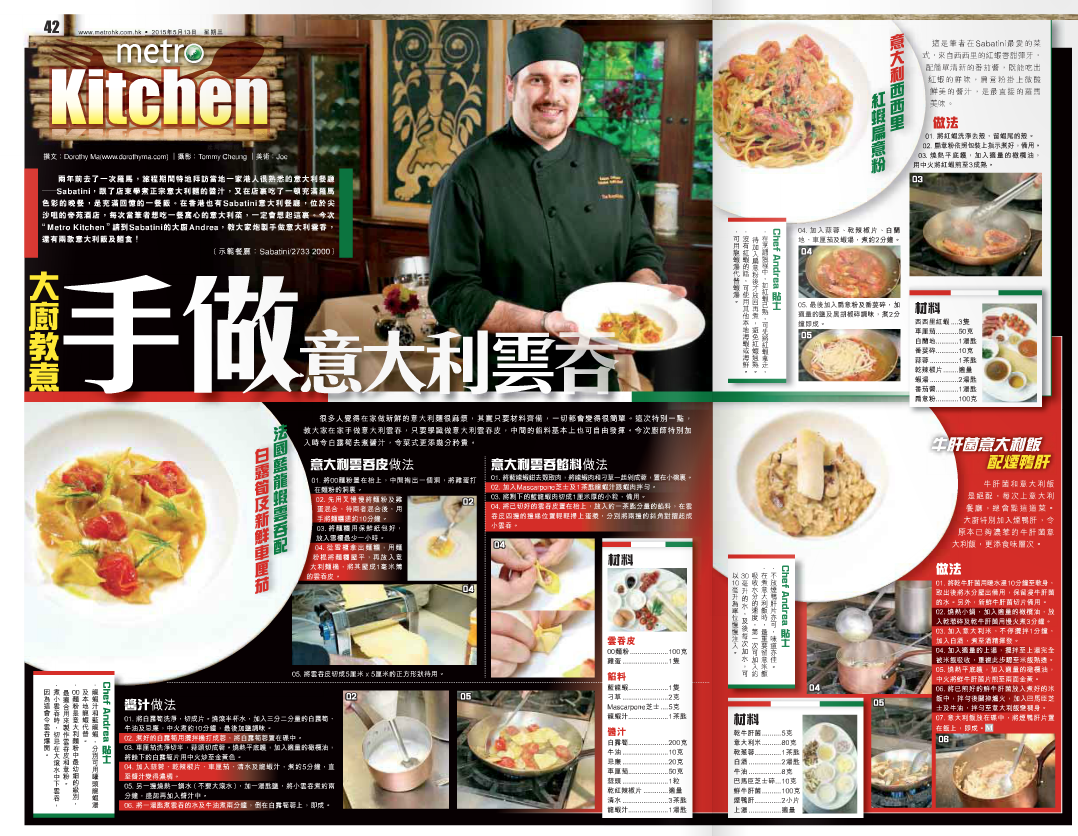 兩年前去了一次羅馬,旅程間特地拜訪當地一家港人很熟悉的意大利餐廳 - Sabatini,跟了店東學煮正宗意大利麵的醬汁,又在店裡吃了一頓充滿羅馬色彩的晚餐,是充滿回憶的一餐飯。在香港也有Sabatini意大利餐廳,位於尖沙咀的帝苑酒店,每次當筆者想吃一餐窩心的意大利菜,一定會想起到這裡。今次<Metro Kitchen>請到Sabatini 的大廚Andrea,教大家做手造意大利雲吞,還有兩款意大利飯及麵食!(示範餐廳:Sabatini 電話:2733 2000)