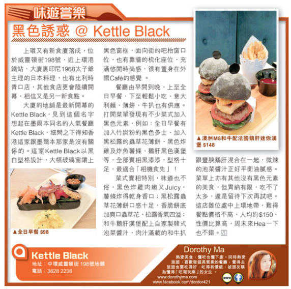 上環又有新食廈落成,位於威靈頓街198號,近上環港鐵站,大廈裏印尼1968太子爺主理的日本料理,也有比利時青口店,其他食店更會陸續開幕,相信又是另一新食點。大廈的地舖是最新開幕的Kettle Black,見到這個名字想起在墨爾本同名的人氣餐廳Kettle Black,細問之下得知香港這家跟墨爾本那家是沒有關係的。這家Kettle Black以黑白型格設計,大幅玻璃窗鑲上黑色窗框,面向街的吧枱窗口位,也有靠牆的梳化座位,充滿悠閒時尚感,很有置身在外國Café的感覺 。餐廳由早開到晚,上至全日早餐,下至輕鬆小吃、意大利麵、薄餅、牛扒也有供應。打開菜單發現有不少菜式加入黑色元素,例如:全日早餐有加入竹炭粉的黑色多士、加入黑松露的蟲草花薄餅、黑色炸雞及炸魚薯條、鵝肝黑色漢堡等,全部賣相黑漆漆,型格十足,最適合「相機食先」!