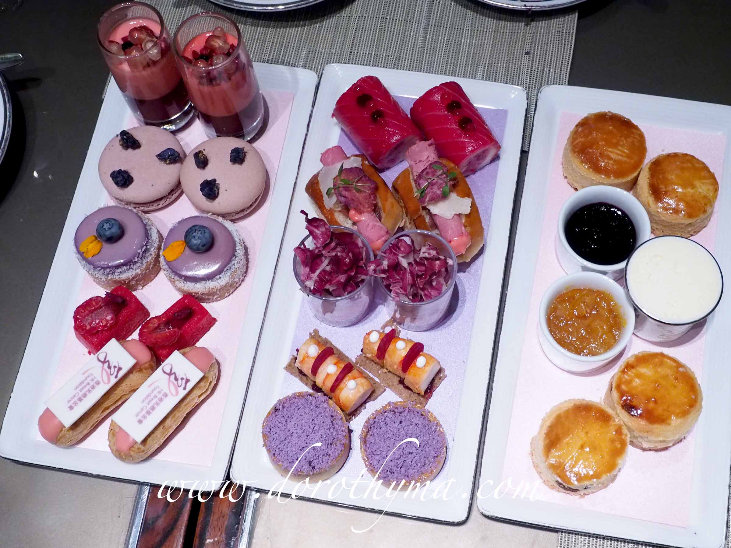 (原文連結:http://www.metrohk.com.hk/?cmd=detail&id=249649) 說起下午茶,相信沒有女生會討厭。要說近期最吸引的下午茶,非朗廷酒店Palm Court莫屬。剛剛新裝修過的Palm Court,以天然石材地板配合上漆木柱,營造出既傳統又高貴的氣氛。下午茶的亮點是跟英國著名瓷器品牌Wedgwood合作,名為「Wedgwood朗廷英式下午茶」,品牌特別為朗廷酒店以其玫瑰圖案度身訂造的碟子及茶具,時刻流露濃厚高貴傳統的英倫風味。 下午茶層架是座地設計,層架足足有我半個人的高度,應是眾多下午茶中最高的一個,顯得特別高雅迷人。 (「Wedgwood朗廷英式下午茶」應是我見過最高級的下午茶(每位$298,兩位$498)) 三層架上的點心,鹹甜點及英式鬆餅俱備。鹹點供應的是迷你三文治,以傳統英式餡料為主,包括:碎蛋沙律、蟹肉青瓜牛油果、番茄火腿芥末、蛋黃醬雞肉及自家煙熏三文魚。三文治的賣相正正是我在倫敦五星酒店吃到的一樣,邊吃邊回憶在倫敦的美好時光。 酒店糕餅總廚Reinhard創作下午茶甜點的靈感,來自層架的高度及Wedgwood的餐具設計,他特別加入兩支高身的草莓波板糖來襯托最高的下午茶層架; 跟玫瑰餐碟相映襯的「玫瑰荔枝慕絲」,朱古力杯中放着玫瑰味紅桑子醬及荔枝慕絲,再以玫瑰花瓣作裝飾,無論食味及賣相皆無懈可擊。一頓令人吃得開懷的傳統英式下午茶,除了層架上的美點外,用來盛着食物的高貴優雅的餐具也很重要,真的會令人吃得分外開懷。標準下午茶定價為每位港幣$298,兩位港幣$498。 (長泡芙(Éclair)也是糕餅總廚的巧手之作,香脆的酥皮外層配合不同口味的幼滑忌廉內餡,十分美味可口。) Palm Court 廷廊 地址: 尖沙咀北京道8號香港朗廷酒店大堂 電話:2132 7898 這麼漂亮的下午茶,拍了好多照片呢~ 英式鬆餅(Scone)配Clotted Cream,草莓及玫瑰果醬。 開動前的開胃Pre Dessert~ 芒果short cake及藍莓金寶也是不可錯過的~ Tiramisu 長泡芙很有特色~