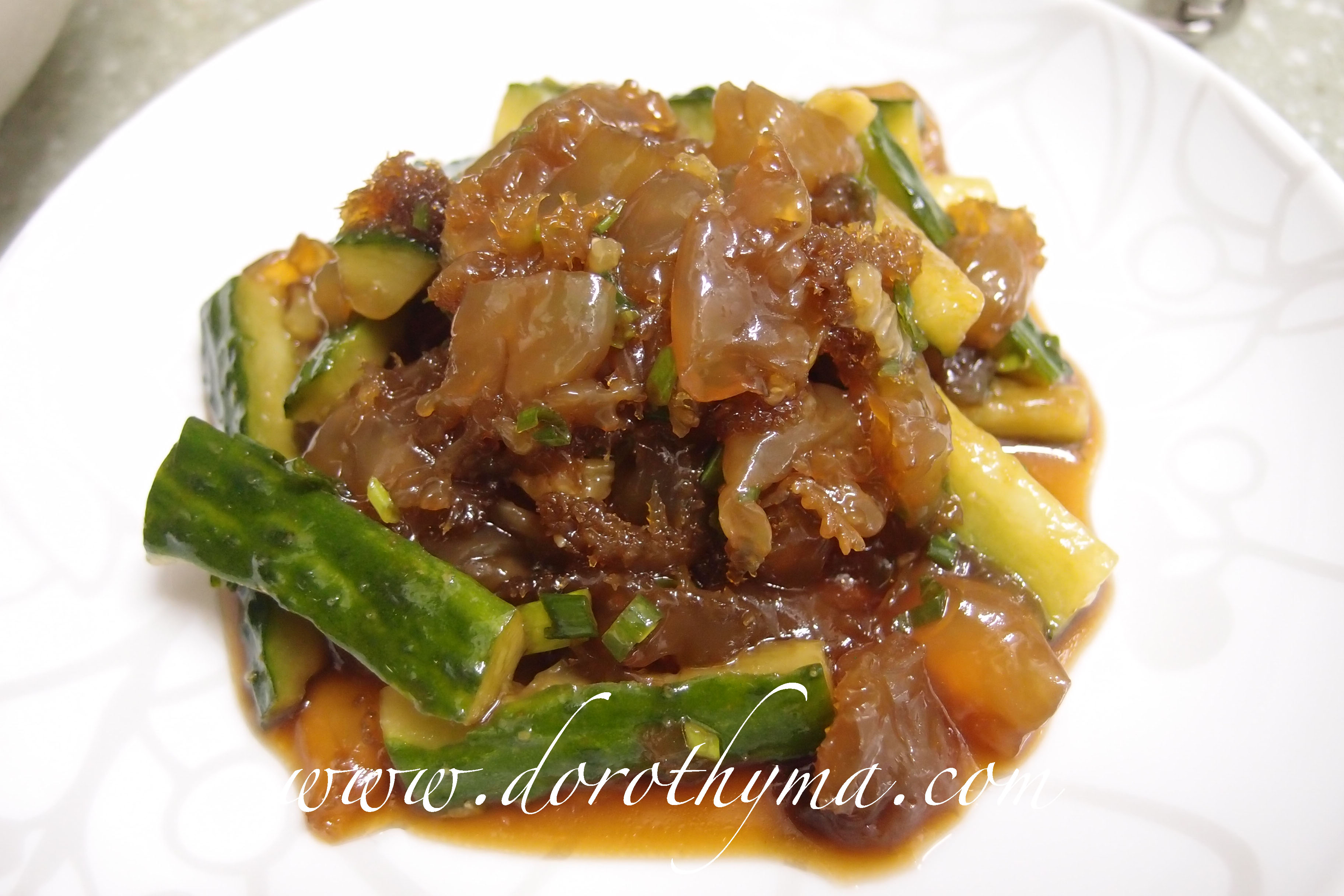 最近又是吃大閘蟹的季節,這兩個月做得好多就是外出去吃大閘蟹,又或是邀請朋友或到朋友家自家蒸蟹。每次吃完蟹,總覺得不夠飽肚,所以每次吃蟹之餘,不外乎做一些炒飯、炒菜,但說到小食,一道陳醋青瓜海蜇頭絕對是一個不錯的選擇。其實這道小食一點也不難做,市面上有很多現成的海蜇發售,但說到比較好質素的海蜇頭,去南貨店買是比較會有保証的。 當大家去南貨店買大閘蟹的時候,其實可順道買現成的海蜇頭,我本身最常去九龍城的新三陽買,這裡的海蜇頭包成盒裝,價錢大約港幣40元一盒,方便衛生。海蜇頭一點也不難處理,加以調味,在家也可以做到跟在上海餐廳吃到的無異。 材料: 海蜇頭 500克 青瓜 半條 蔥花 1茶匙 海鹽 1茶匙   調味料: 陳醋 4湯匙 生抽 1茶匙 麻油 1茶匙 海鹽 少許 糖 1茶匙 白胡椒粉 少許   做法: 1)海蜇頭用1茶匙海鹽拌勻,再用冰水沖一沖。 2)青瓜洗淨,切成5cm長,有用刀拍扁,備用。 3)海蜇頭隔水後,放進大碗中,再將青瓜加入。 4)將調味料及蔥花加入,跟青瓜海蜇頭拌勻。 5)放進雪櫃大約半小時,隔去調味汁上碟,即成。 Remarks: 喜歡吃蒜的話,在調味的時候,可多加一茶匙蒜蓉,更惹味啊~